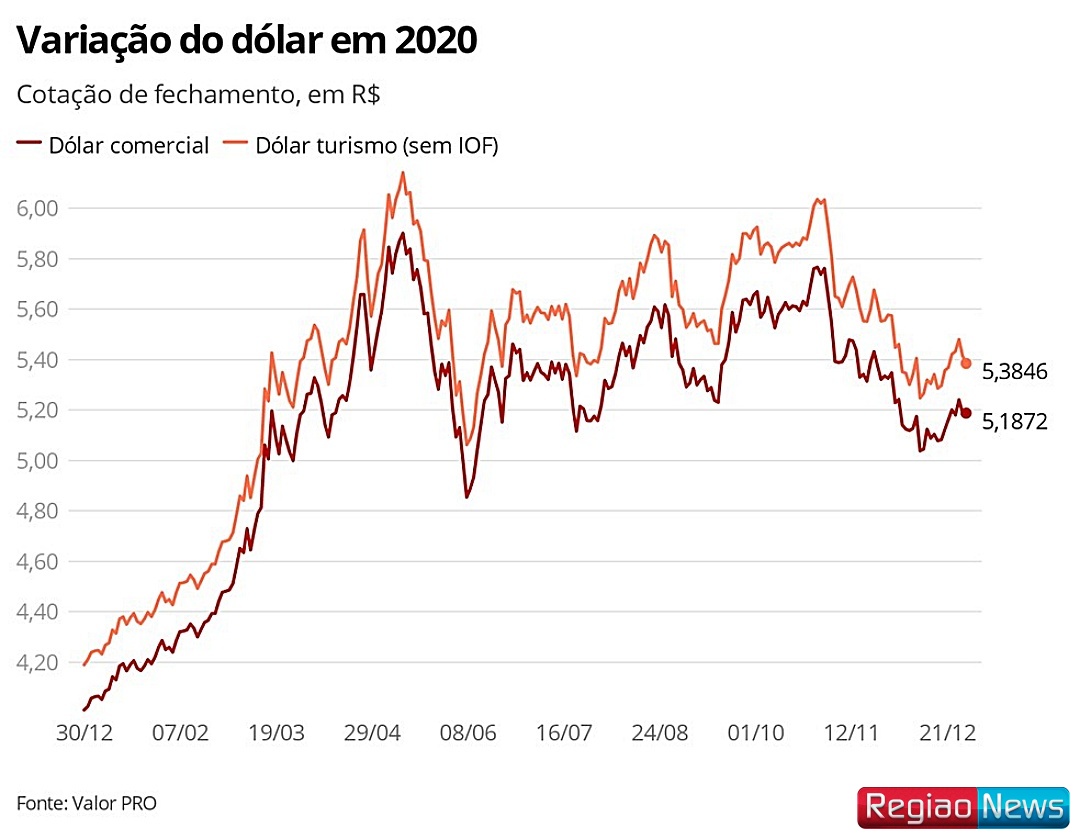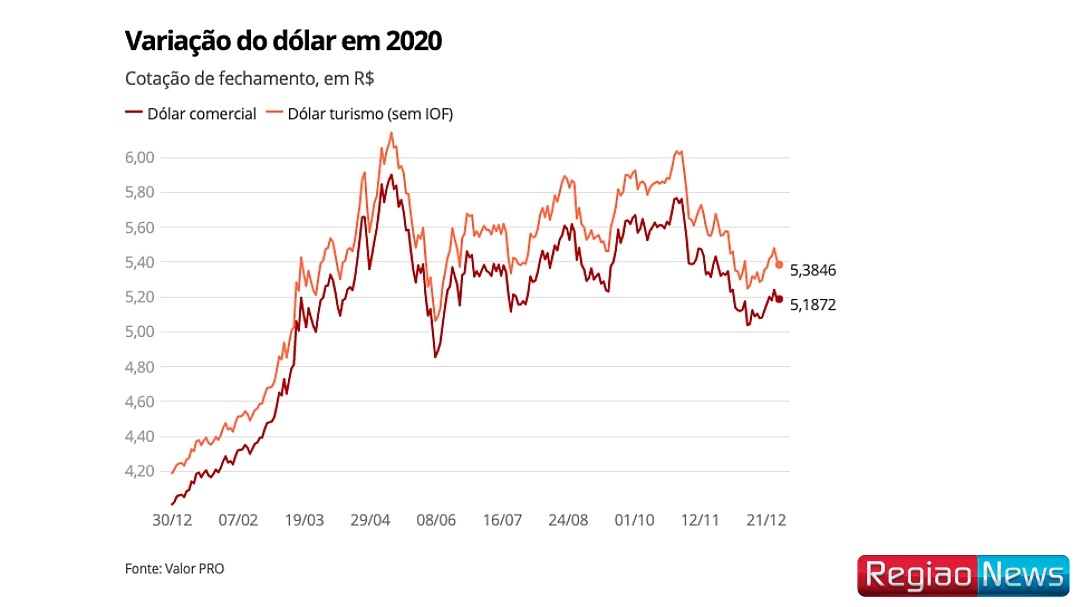 Em 2020, o dólar acumulou alta de 29,36% e encerrou o último pregão do ano passado a R$ 5,1872.