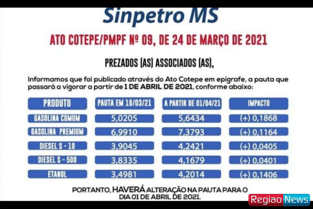 O valor de referência para a cobrança do tributo estadual sobre o etanol passou de R$ 3,49 para R$ 4,20, que deve impactar em reajuste de R$ 0,14 nas bombas. Já o diesel S-10 e s-500, o impacto será de R$ 0,04.