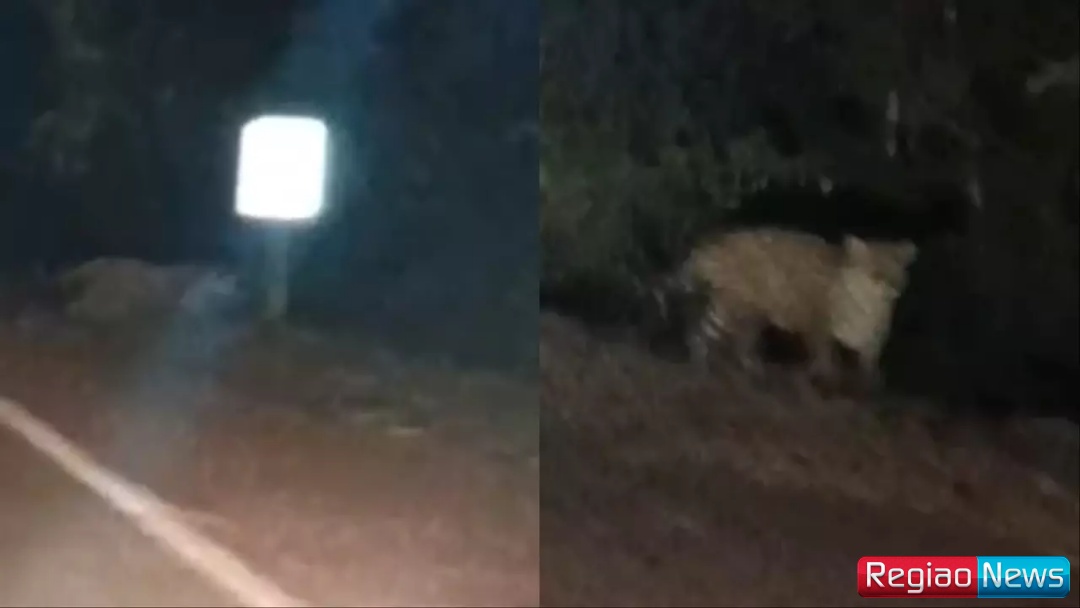 Apesar da aparição rápida, é possível notar o animal, aparentemente um felino adulto, no acostamento. “Ela estava no acostamento, mas quando fiz o retorno para filmar, ela estava atravessando a rodovia”, descreve.