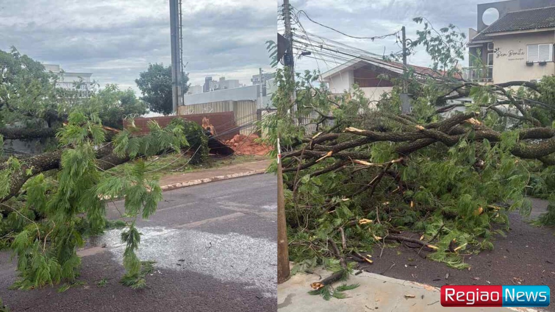 A força das rajadas de vento derrubou a árvore com a raiz. Consequentemente, a fiação elétrica foi arrastada na queda. Uma equipe da concessionária Energisa está no local e deve substituir pelo menos cinco postes de luz. A rua ficará interditada durante a manutenção.