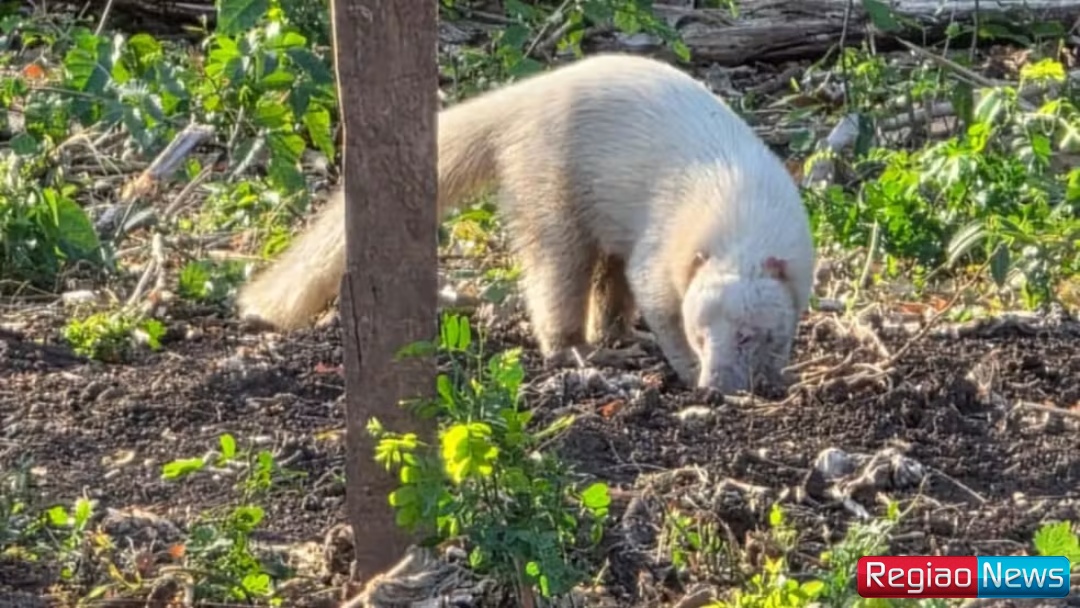 Um quati albino foi avistado em um assentamento de Corumbá, no Mato Grosso do Sul. O registro foi feito pelo servidor público Renato de Oliveira Carvalho, que estava em um sítio no assentamento Taquaral quando percebeu o animal de pelagem branca.