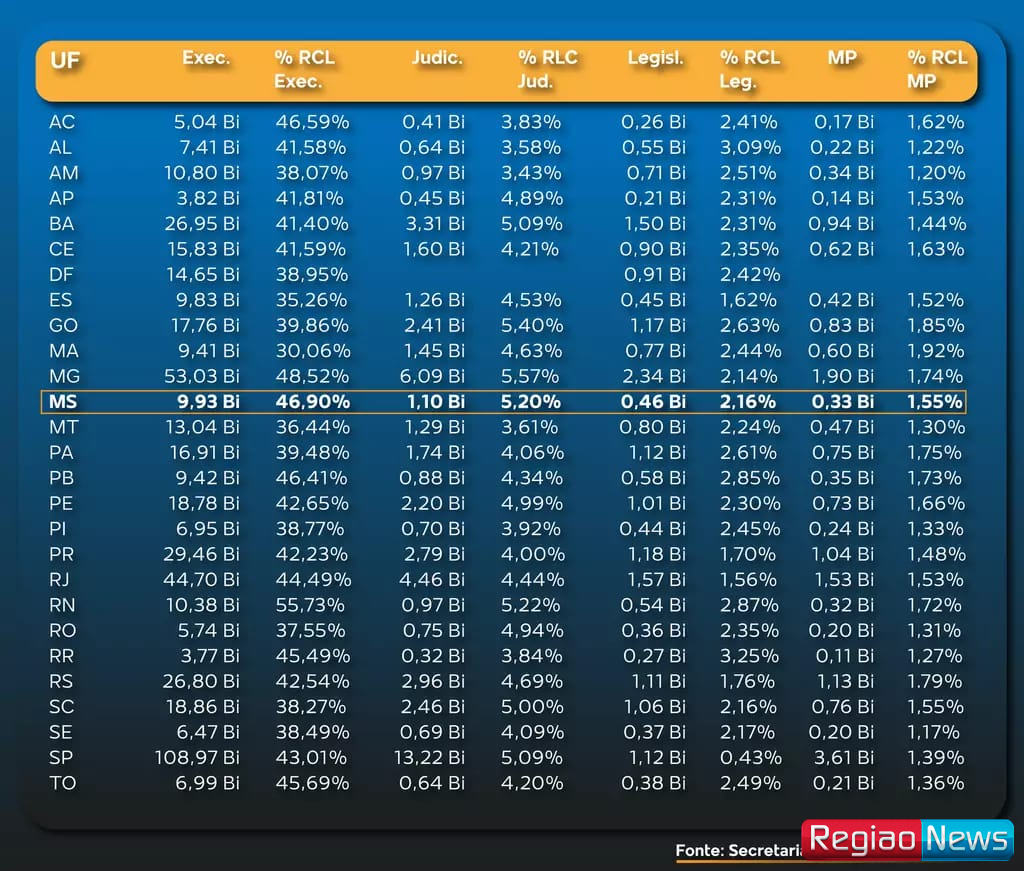Com 46,90% da receita corrente líquida comprometida com despesas de pessoal, o Governo de Mato Grosso do Sul ocupa o 3º lugar no ranking nacional de comprometimento de receita com folha salarial, atrás apenas de Rio Grande do Norte (55,73%) e Minas Gerais (48,52%).