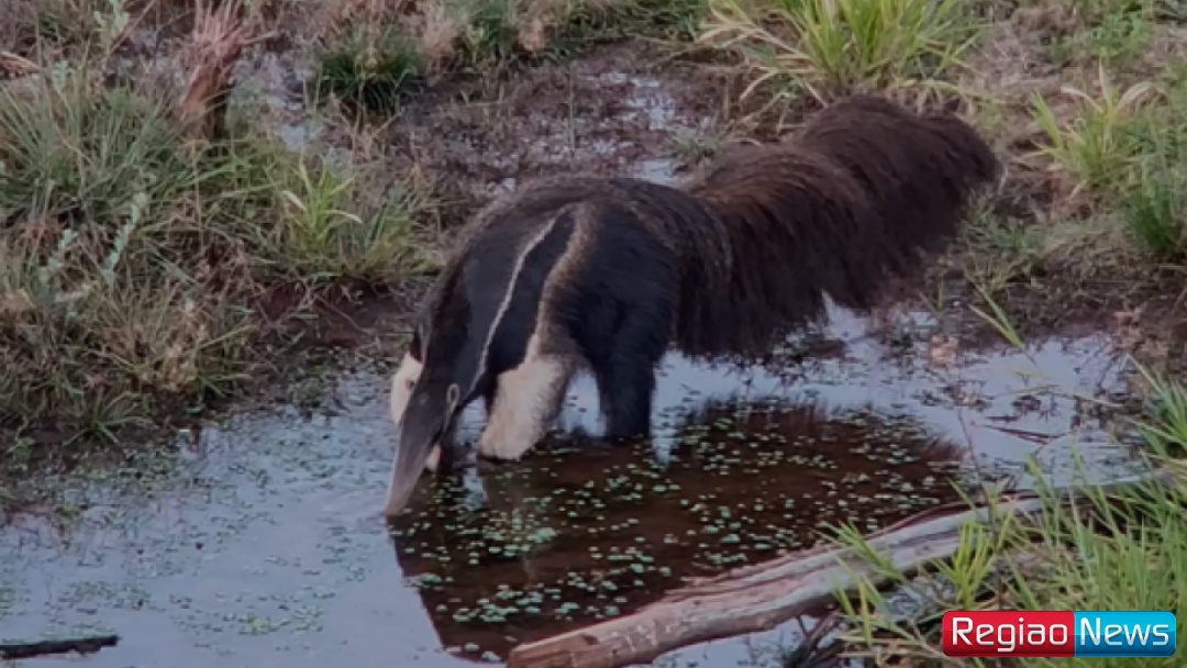 Com o calorão que atingiu 40,1 °C nesta segunda-feira (15), segundo dados do Instituto Nacional de Meteorologia (Inmet), no município, o tamanduá encontrou um verdadeiro oásis e, sem cerimônia, bebericou um pouco de água, deitou para molhar um lado do corpo e rolou para o outro.
