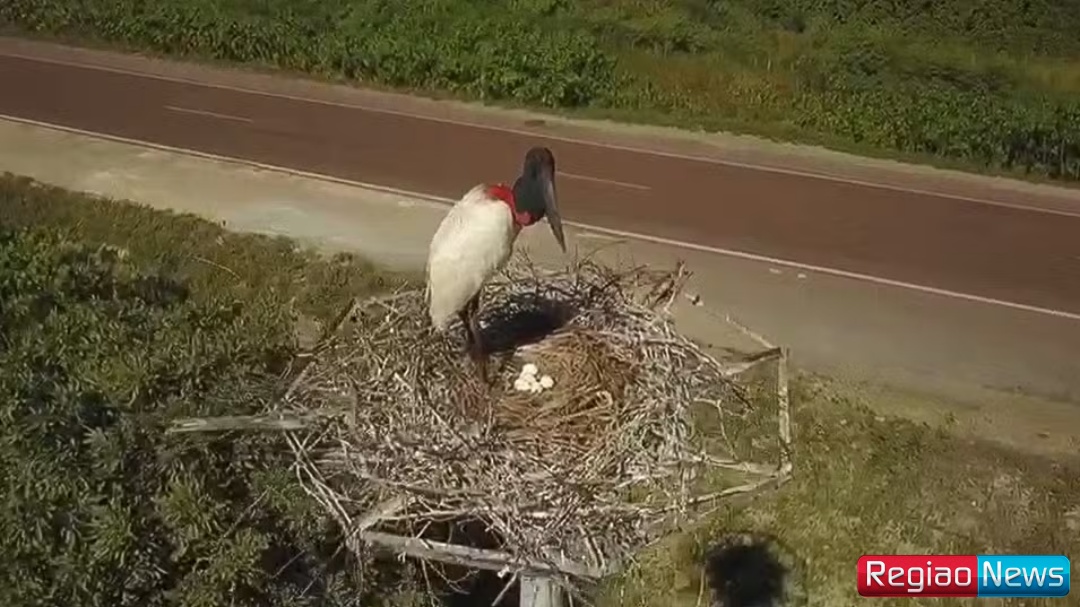 Um tuiuiú foi filmado no alto de um ninho artificial com cinco ovos, no coração do Pantanal, entre Miranda e Corumbá (MS). O flagrante foi feito pelo repórter cinematográfico Jairton Costa nessa segunda-feira (21). A imagem foi feita com auxílio de drone e sem afetar os animais.