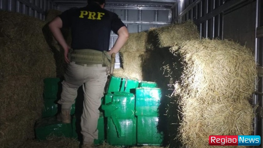 Durante a fiscalização, o motorista disse que transportava fardos de feno, mas durante a fiscalização, os policiais encontraram grande quantidade de maconha escondida na carga de feno.