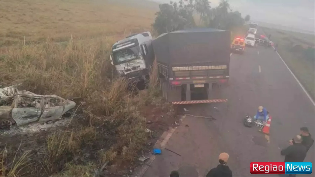 A ocorrência foi registrada por volta das 4h35 da madrugada e envolveu um carro de passeio, com placas do Paraguai, e uma carreta.