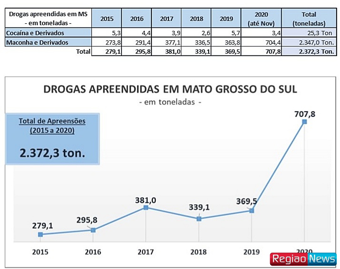 Balanço divulgado pela Secretaria de Estado de Justiça e Segurança Pública (Sejusp) mostra que só este ano as polícias estaduais tiraram de circulação, de janeiro a novembro, mais de 707 toneladas de drogas em Mato Grosso do Sul. O aumento é de 103% em comparação com o mesmo período do ano passado, quando foram apreendidas pouco mais de 348 toneladas de drogas.