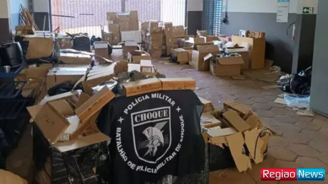 No galpão, três homens foram abordados. Dentro do baú e de um cômodo, foram localizadas várias caixas prontas para o transporte. Eram produtos vindos do Paraguai: celulares, perfumes, cartões de memória, cigarros eletrônicos.