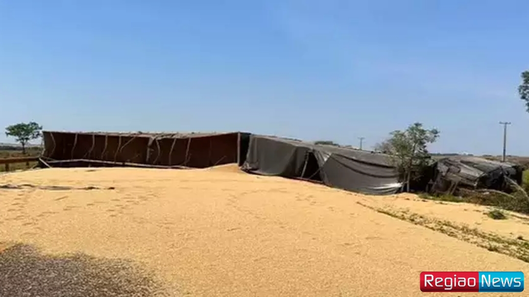 Carreta carregada com soja tombou durante colisão com um Toyota Cross, na BR-163, trecho do KM-355, situado entre os municípios de Nova Alvorada do Sul e Rio Brilhante. O acidente, que aconteceu no fim da tarde deste domingo (22), deixou dois feridos.