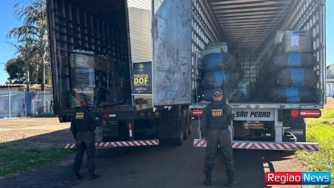 Dois caminhões carregados com mercadorias ilegais foram apreendidos neste domingo (6) por policiais do Departamento de Operações de Fronteira (DOF), durante um bloqueio na MS-040, na zona rural de Campo Grande.