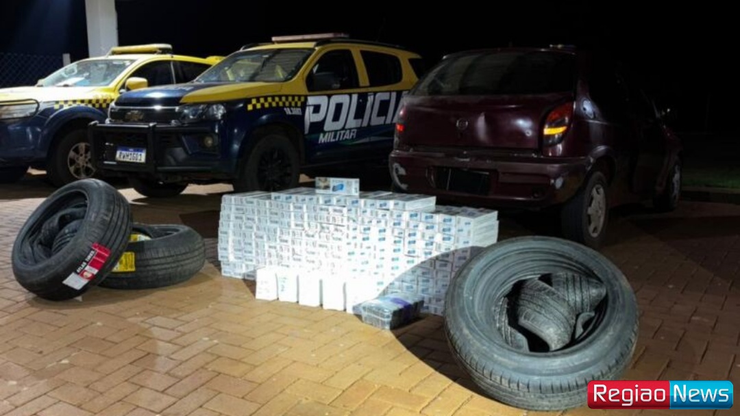 Os policiais abordaram um veículo Chevrolet Celta e, durante a vistoria, encontraram 20 pneus de medidas diversas (quatro deles apelidados de “bolas”), 200 pacotes de cigarros das marcas Fox e Palermo, 100 baterias de iPhone 11 Pro e 50 baterias de modelo A54.
