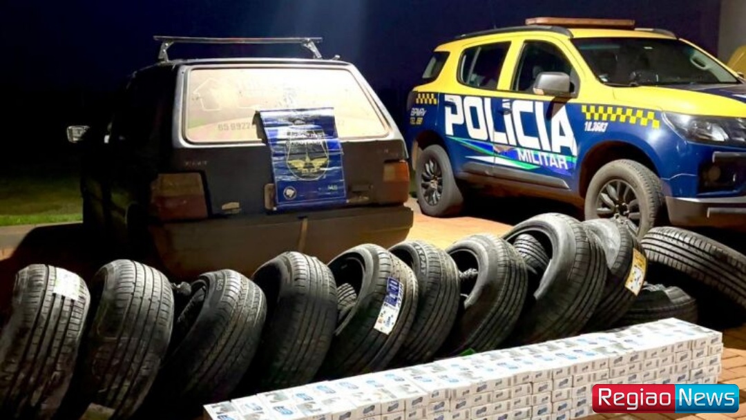 Os policiais abordaram um Fiat Uno e, durante a vistoria, encontraram 11 bolas de pneus, totalizando aproximadamente 55 unidades, além de 120 pacotes de cigarros da marca FOX, todos de origem estrangeira e sem comprovação fiscal. A ocorrência caracteriza o crime de descaminho, conforme a legislação brasileira.