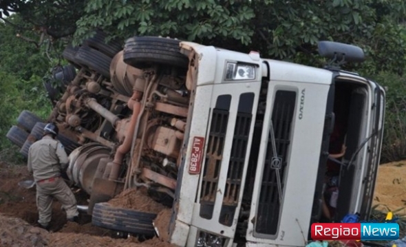 Uma carreta bitrem carregada de milho, tombou no quilômetro 725 da BR-163, entre Coxim e Rio Verde, no final da tarde de ontem (10).
