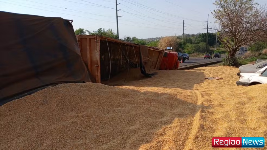 Uma carreta com 49 toneladas de milho tombou na BR-163, próximo ao bairro Jardim Montevidéu, em Campo Grande.