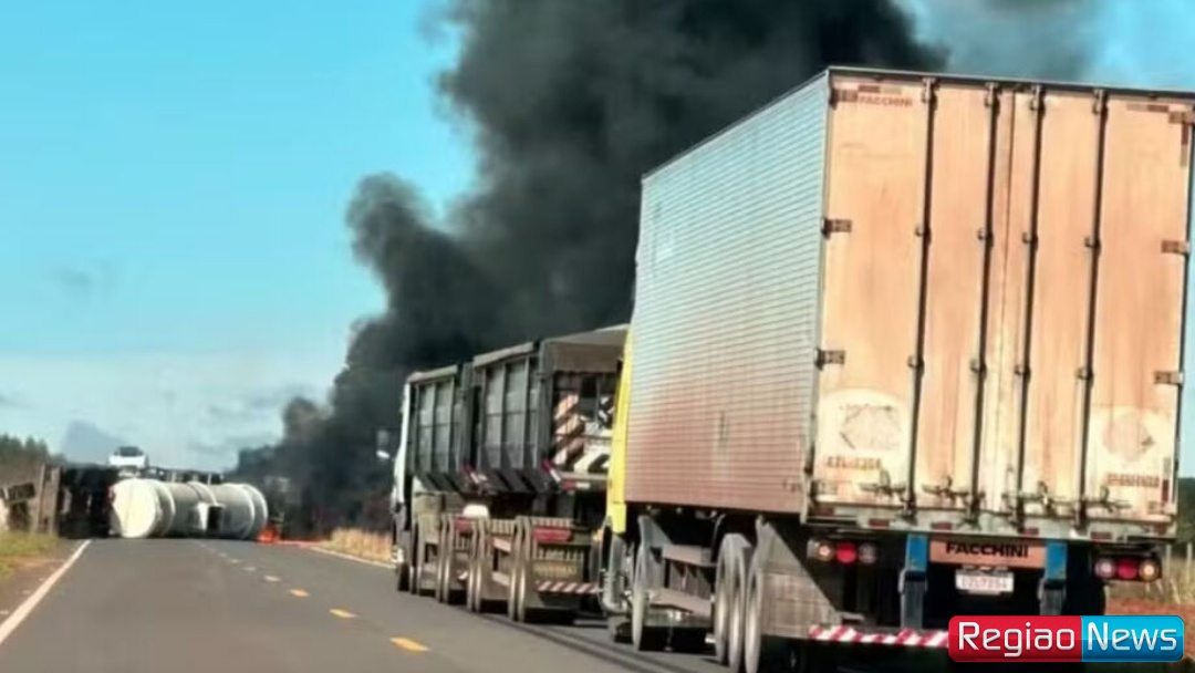 De acordo com as primeiras informações, a carreta de combustível tombou, o que causou o incêndio e deixou o trânsito parado nos dois sentidos na rodovia e sem previsão de liberação.