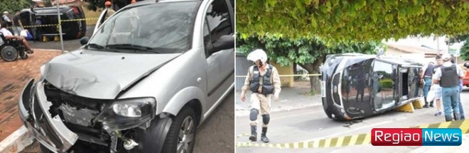 Uma colisão entre dois veículos em um cruzamento causou o capotamento de um deles. Ferida, a motorista Luciane Taiara foi retirada pelo teto solar do veículo e encaminhada ao Prontomed.