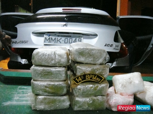 A Polícia Rodoviária Estadual apreendeu 1,1kg de cocaína e 8 tabletes de pasta base, que somaram 10,3kg, em um Peugeot 206, ontem (05) a noite em Dourados.