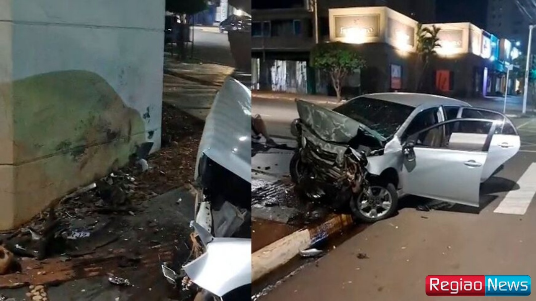 Carro fica destruído ao acertar muro de prédio na Rua Bahia, em Campo Grande