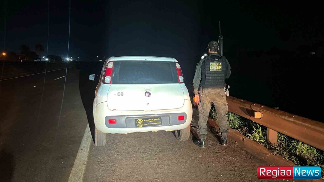 Carro modelo Uno levado durante um assalto em frente de uma farmácia no distrito de Vila Vargas, em Dourados, a 225 quilômetros de Campo Grande, foi encontrado abandonado na BR-163 na noite dessa terça-feira (8).