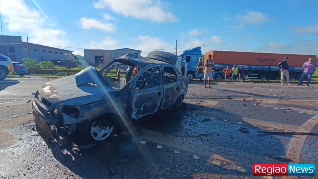 Carro pega fogo em acidente na BR-163 entre Dourados e Caarapó