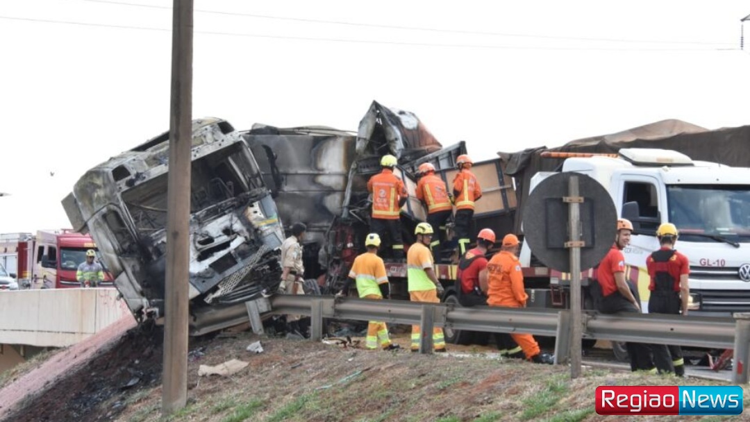 “Quando houve a colisão, a cabine foi deformada. Então a vítima não conseguiu sair. Ela ficou presa, ficou retida, às ferragens. E aí veio o fogo. A gente ainda não teve acesso ainda ao corpo, porque está prensado. Então logo a perícia libera e a gente vai fazer o afastamento das carretas”, declarou o Tenente Luan Luiz Rodrigues Nogueira, do Corpo de Bombeiros.