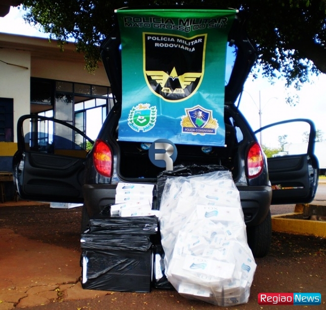 Foram apreendidos 300 pacotes de cigarro em um Celta com placas de Campo Grande que era conduzido por um homem de 44 anos, a mercadoria veio de Ponta Porã e seria comercializada na capital.