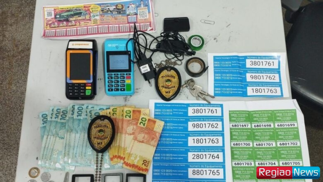 As diligências seguiram até o hotel onde o homem estava hospedado. No quarto, foram localizados outros três dispositivos do mesmo tipo, duas máquinas de cartão, cerca de R$ 2 mil e adesivos falsos com números de “suporte técnico”. O material era usado para induzir as vítimas a fornecer dados sigilosos, facilitando os golpes.