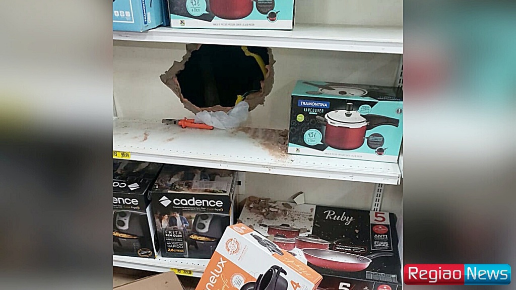 Ladrão usa picareta, abre buraco na parede de loja para roubar e foge com disparo de alarme