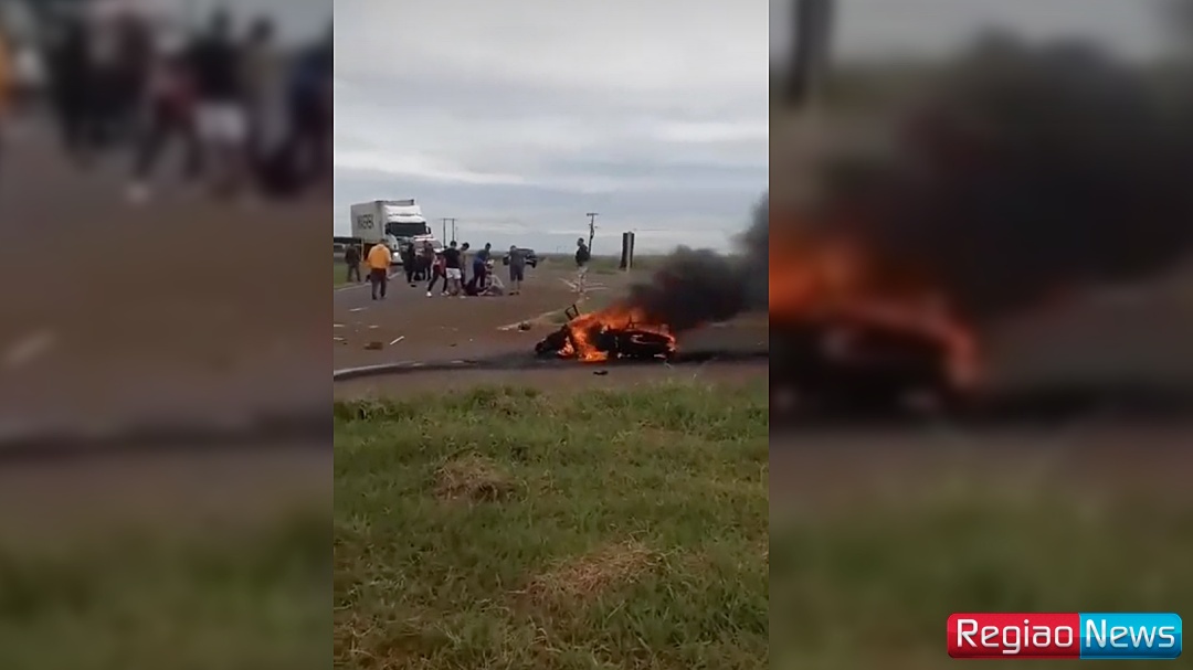 Motocicleta ocupada por um casal pegou fogo neste domingo (19), após bater com um carro, na rodovia MS-060, no distrito de Capão Seco, em Sidrolândia, distante 71 quilômetros de Campo Grande.
