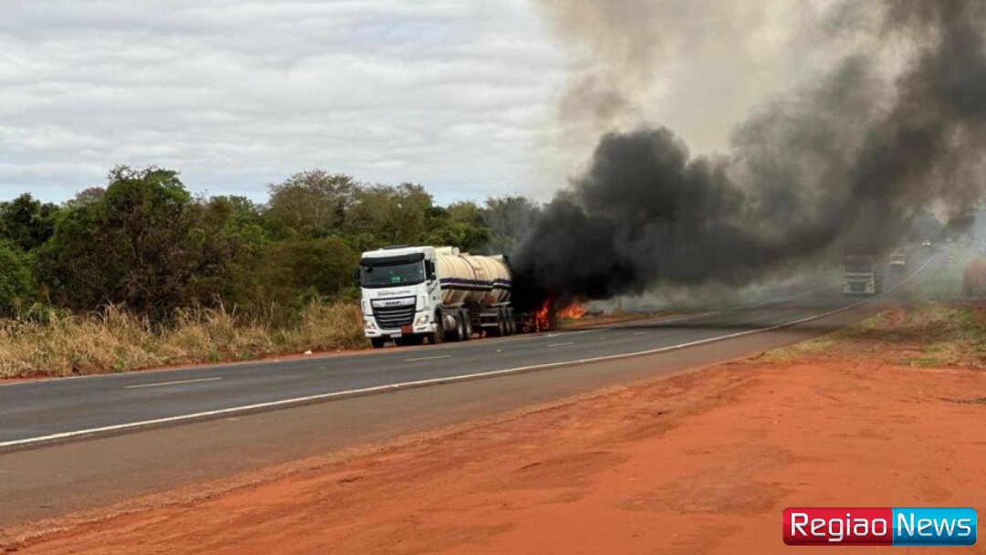 Na manhã desta segunda-feira (25) mostram uma cena curiosa, com motoristas "desafiando" o fogo que tomava conta de uma carreta que estava carregada com 50 mil litros de álcool, em trecho da BR-267 no interior de Mato Grosso do Sul.