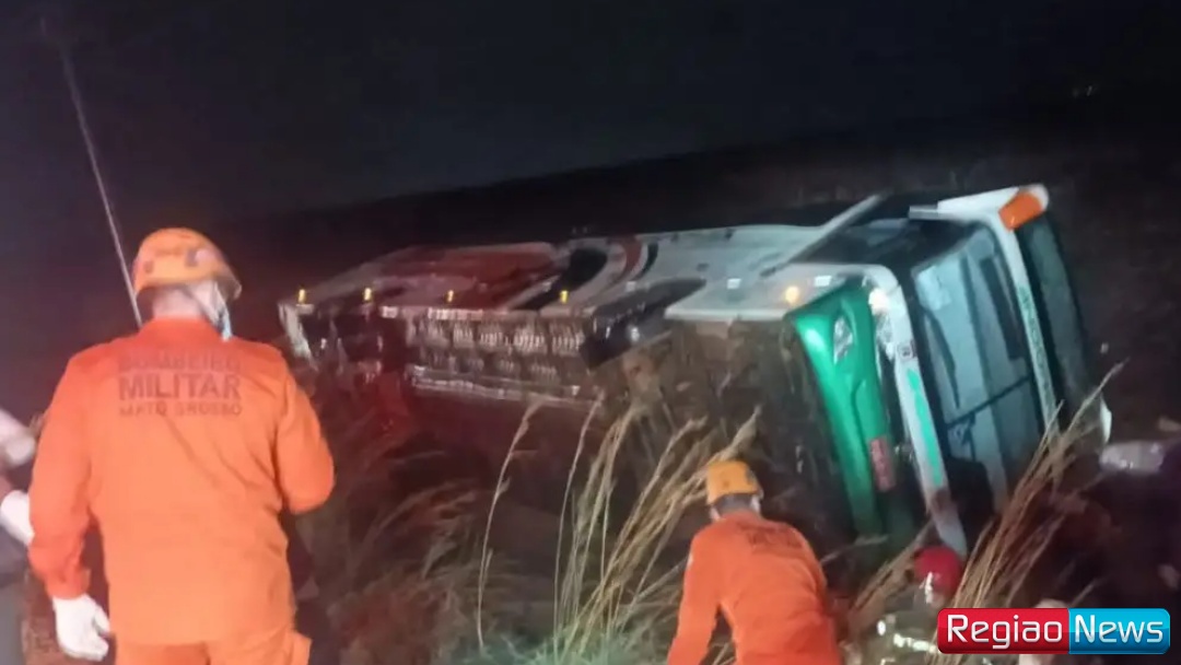 Um ônibus de viagem com 33 passageiros tombou na BR-070, sentido Barra do Garças (MT), na noite dessa quarta-feira (8). Segundo o Corpo de Bombeiros, algumas vítimas apresentaram ferimentos e foram encaminhadas para unidades médicas, sem registro de mortes.