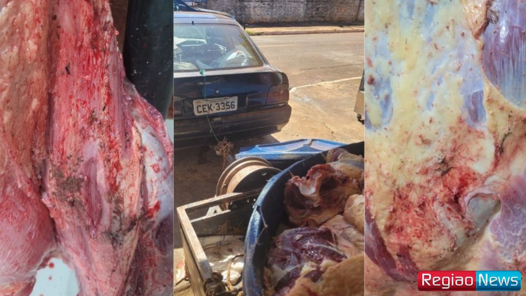 Colocada em uma carroceria sem controle de temperatura, a carne não possuía qualquer mínimo cuidado de higiene quando os agentes chegaram no açougue no momento em que o homem realizava a entrega.