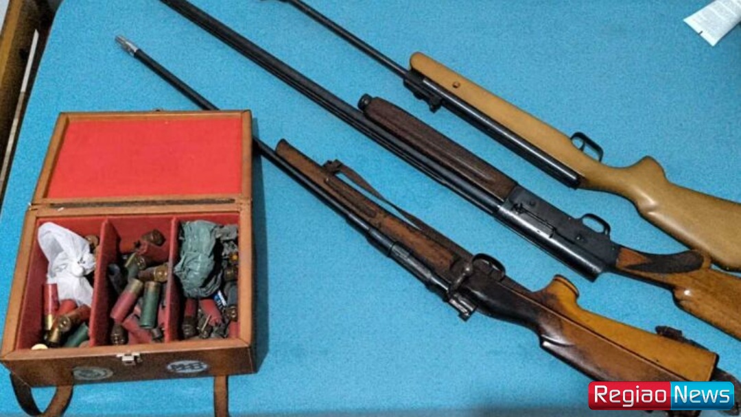 Durante as buscas, três armas de fogo foram encontradas — uma espingarda calibre 12, uma espingarda calibre 28 e uma espingarda de ar comprimido calibre 5.5 — além de diversas munições de calibres 12, 28, 36 e .38, algumas intactas e outras deflagradas. O material estava guardado em diferentes cômodos da residência, juntamente com documentos pessoais.
