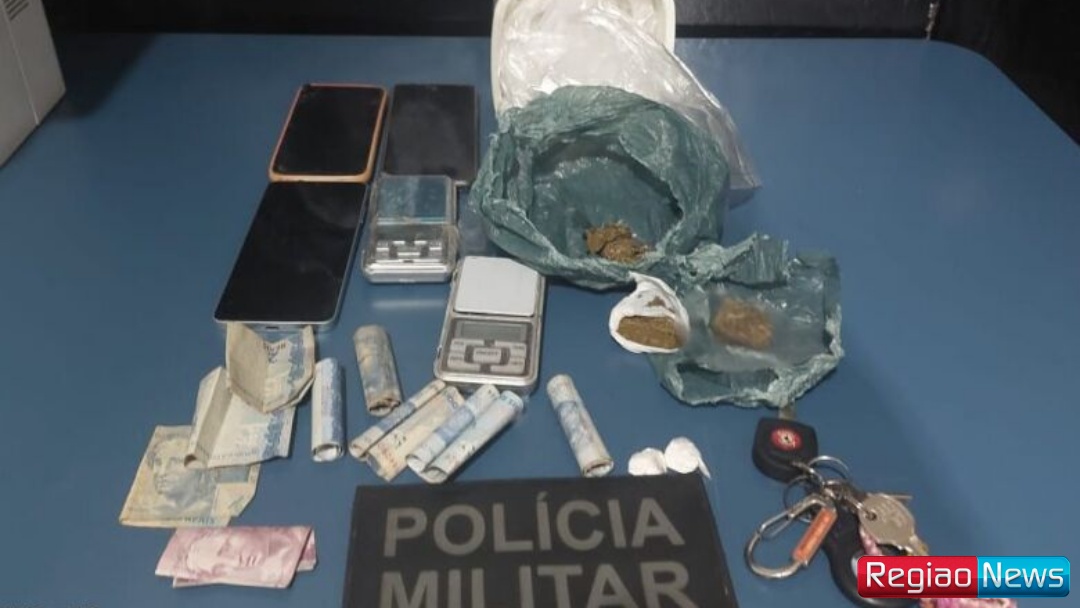 No local, foram apreendidos 24,5 gramas de maconha; 2 balanças de precisão; invólucros para embalo de drogas; e 4 aparelhos celulares.