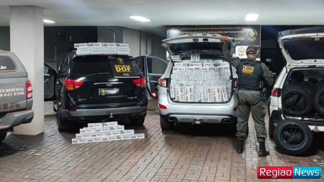 Policiais militares do Departamento de Operações de Fronteira (DOF) apreenderam, na noite desta terça-feira (4), três veículos carregados com pneus e cigarros de origem estrangeira. Na ação ninguém foi preso.