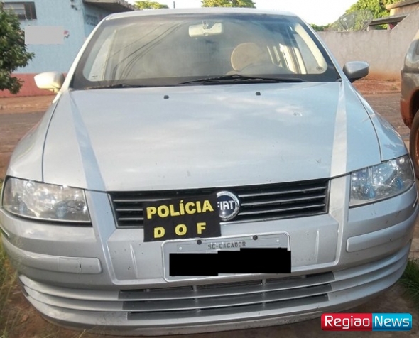 Os policiais do Departamento de Operações de Fronteira (DOF) recuperaram ontem (15) um veículo Fiat Stilo de Caçador (MG) que havia sido furtado no dia 24 de dezembro do ano passado em Itajaí (SC). Junto ao sistema de informações do DOF foi constatado que as placas verdadeiras do veículo também eram de Santa Catarina.
