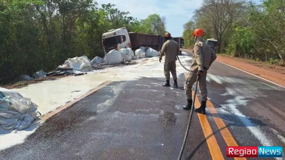 Próximo à placa de acesso ao distrito aquidauanense de Taunay, a roda traseira cai na cavaleta do lado direito da pista e desequilibra o veículo, tombando a carga de 32 toneladas do que aparenta ser "borato", enquanto a cabine acaba desacoplando do semirreboque sem causar maiores danos ao motorista.