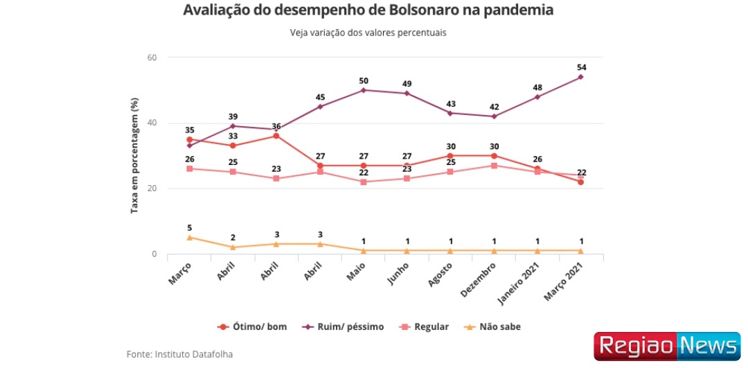- 54% avaliam como ruim ou péssima a atuação de Bolsonaro na pandemia (janeiro: 48%; dezembro: 42%; agosto: 43%; junho: 49%; maio: 50%; abril: 45%; abril: 38%; abril: 39%; março: 33%)