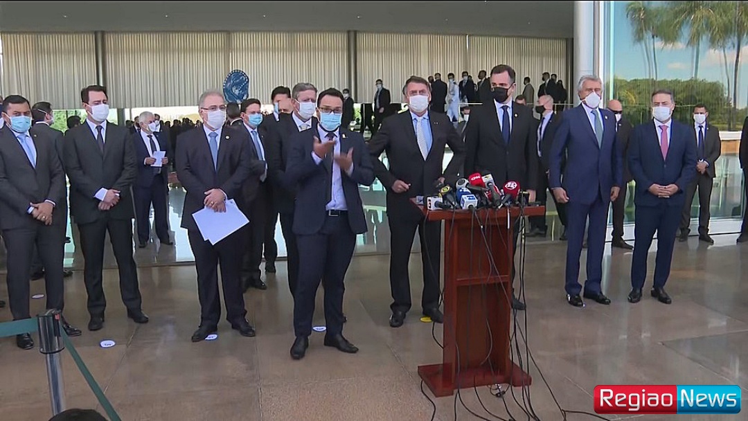 Após reunião na residência oficial do Palácio da Alvorada com governadores, ministros e chefes de poderes, o presidente Jair Bolsonaro anunciou a criação de um comitê em parceria com o Congresso para definir medidas de combate à pandemia de Covid-19. Ainda de acordo com Bolsonaro, caberá ao presidente do Senado, Rodrigo Pacheco (DEM-MG), levar ao comitê as demandas dos governadores.