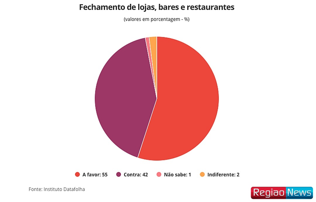 - Fechamento de lojas, bares e restaurantes: 55% a favor; 42% contra; não sabem, 1%; e indiferentes, 2%.