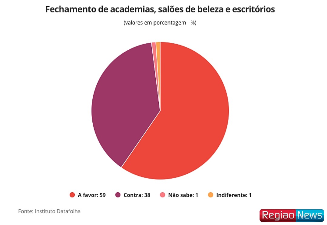 - Fechamento de academias, salões de beleza e escritórios: 59% a favor; 38% contra; não sabe, 1%; e indiferentes, 1%.