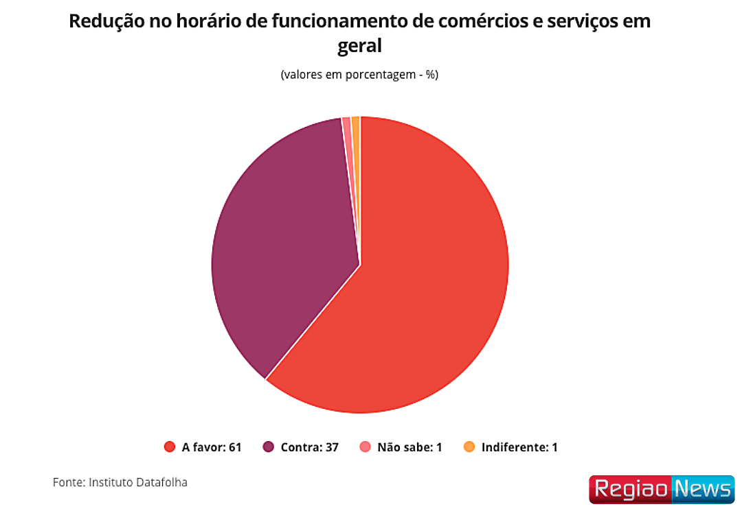 - Redução no horário de funcionamento de comércios e serviços em geral: 61% a favor; 37% contra; não sabem, 1%; e indiferentes, 1%.