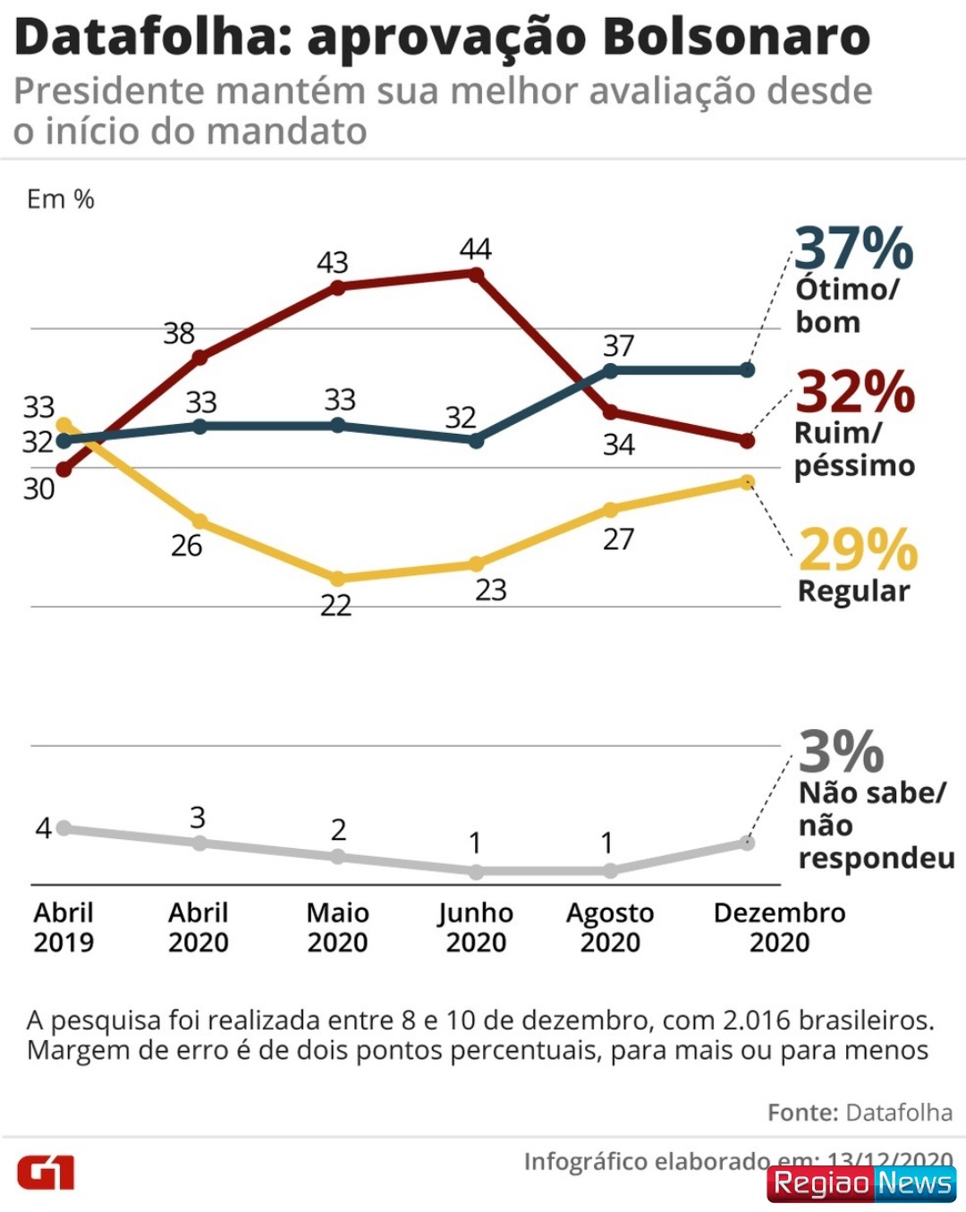 - abril de 2020: Ótimo/bom: 33%; Regular: 26%; Ruim/péssimo: 38%; NS/NR: 3%
