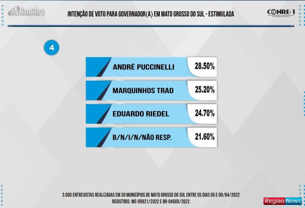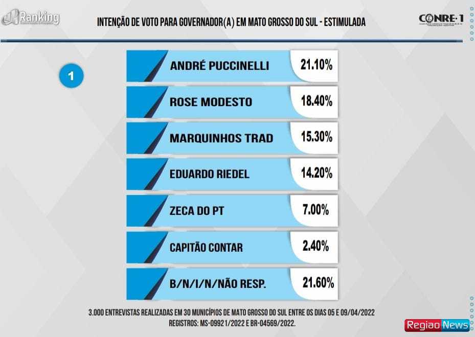 No cenário da pesquisa estimulada com três nomes sem Rose Modesto e o Capitão Contar, André Puccinelli foi citado por 28,50% dos entrevistados; Marquinhos Trad pontuou 25,20% e Eduardo Riedel somou 24,70%. Indecisos, votos nulos e em branco, não sabem e não responderam 21,60%.