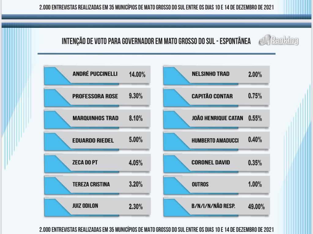 O levantamento espontâneo, onde o entrevistado responde sem os nomes, mostra Puccinelli com 14.0%; Rose com 8.3%; Riedel com 5 %; Zeca 4.05%; Tereza Cristina 3.2%; Odilon 2.3%; Nelsinho Trad 2%, e mais quatro nomes abaixo de 1%.