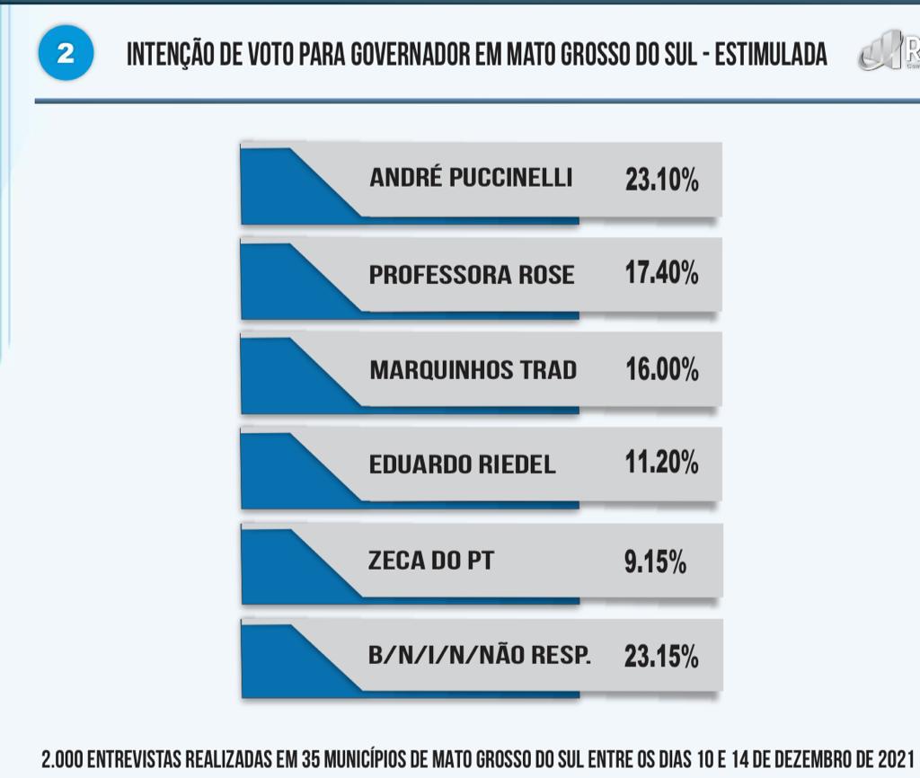 O levantamento, que mais se aproxima do quadro politico eleitoral real, é o que pesquisa apenas cinco candidatos, André, Riedel, Rose, Marquinhos e Zeca, e não tem nomes já lançados para outros cargos, como o juiz Odilon de Oliveira, já em campanha para o senado.