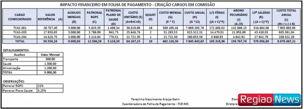 O Tribunal de Contas de Mato Grosso do Sul (TCE-MS) protocolou na Assembleia Legislativa (Alems) um projeto de lei que prevê a criação de 19 cargos em comissão, com justificativa de atender ao aumento da demanda de trabalho do órgão. A proposta será discutida na próxima sessão, marcada para terça-feira (2). O impacto financeiro anual estimado é de R$ 8.879.487,21.
