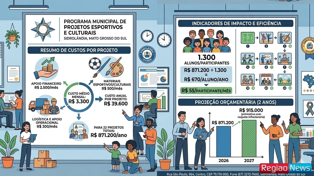 A Câmara Municipal de Sidrolândia aprovou o Projeto de Lei nº 12/2026, que institui o Programa Municipal de Formação Esportiva e Cultural, com previsão de investimento de R$ 871,2 mil em 2026.