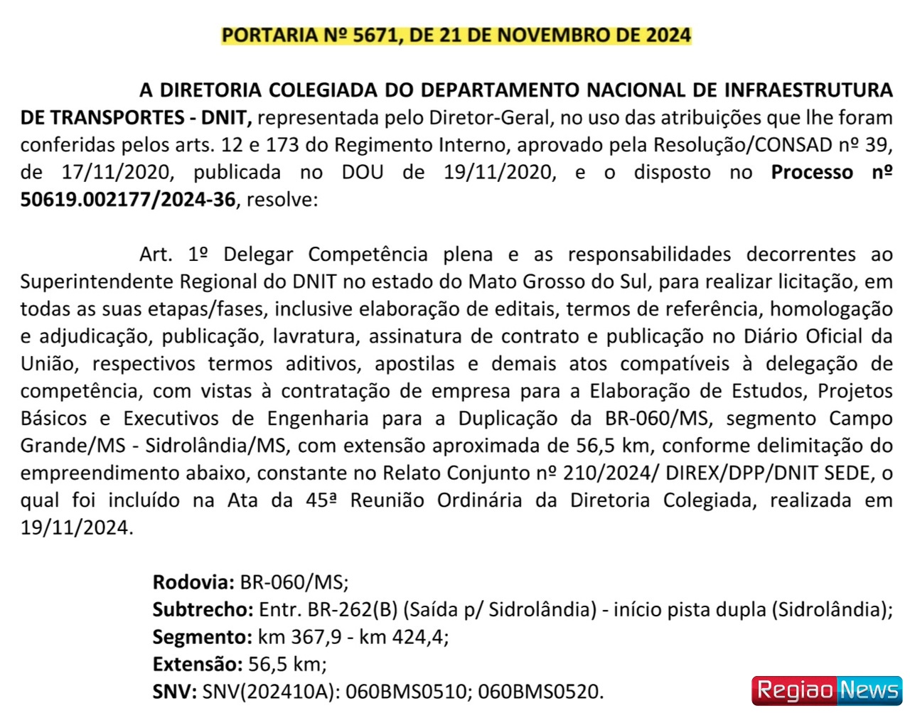 O presidente da Assembleia Legislativa, Gerson Claro, anunciou durante a sessão desta terça-feira, que o diretor-geral do DNIT, Fabrício de Oliveira Galvão, assinou a portaria 5671, que delega poderes ao superintendente do Departamento Nacional de Infraestrutura de Transporte em Mato Grosso do Sul, Euro Nunes, para licitar a contratação do projeto executivo da duplicação da BR-060, trecho de 56,5 km entre Campo Grande (km-367,9) e Sidrolândia (km 424,4)