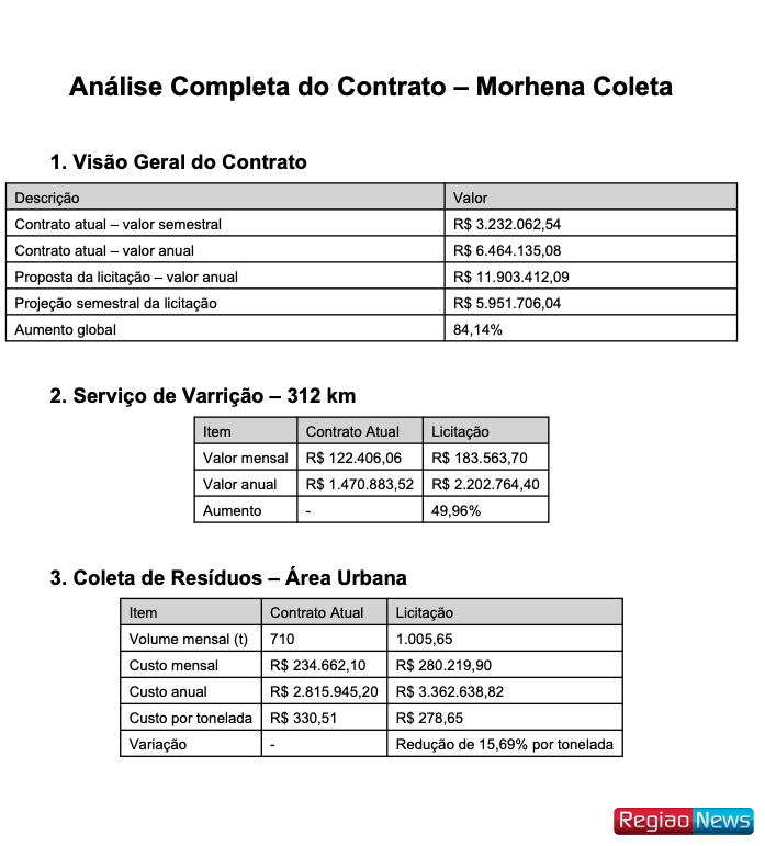 Nos distritos, o cenário é oposto. A ampliação da frequência da coleta, em alguns casos passando de uma para duas vezes por semana, vem acompanhada de expressivos aumentos no custo por tonelada e no valor total dos contratos.